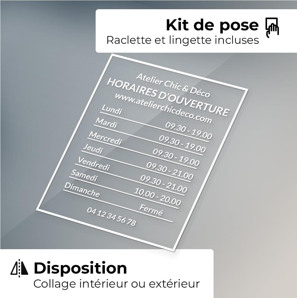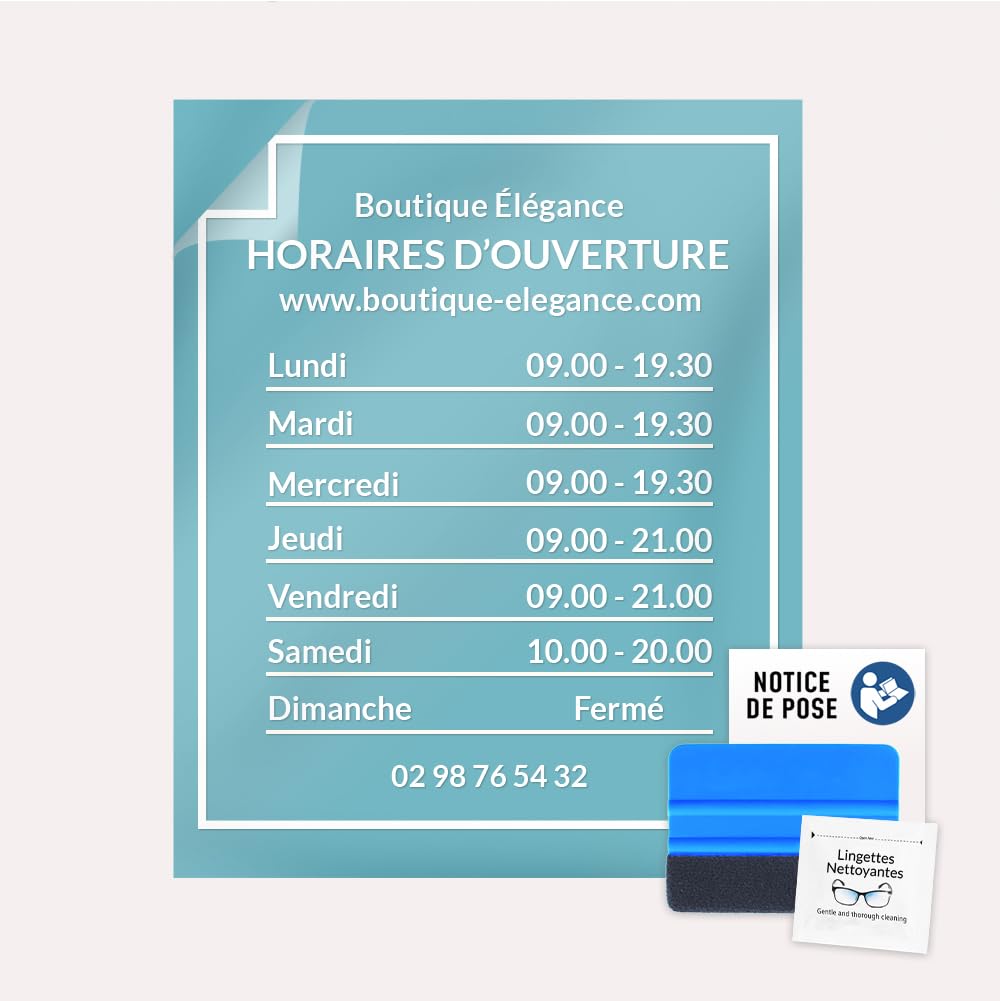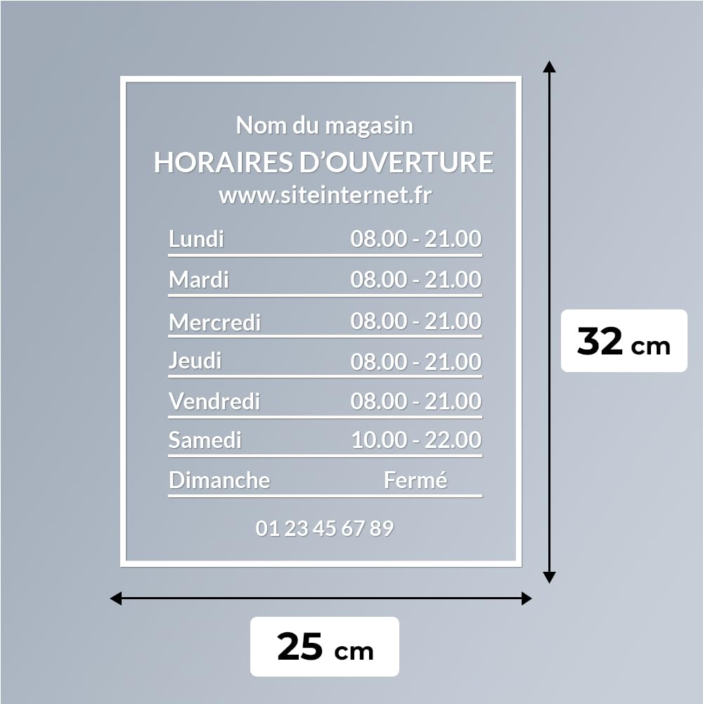 - Personnalisation parfaite : Créez des horaires de magasin personnalisés avec un autocollant de qualité de 30 x 20 cm pour afficher les informations de votre entreprise de manière professionnelle.