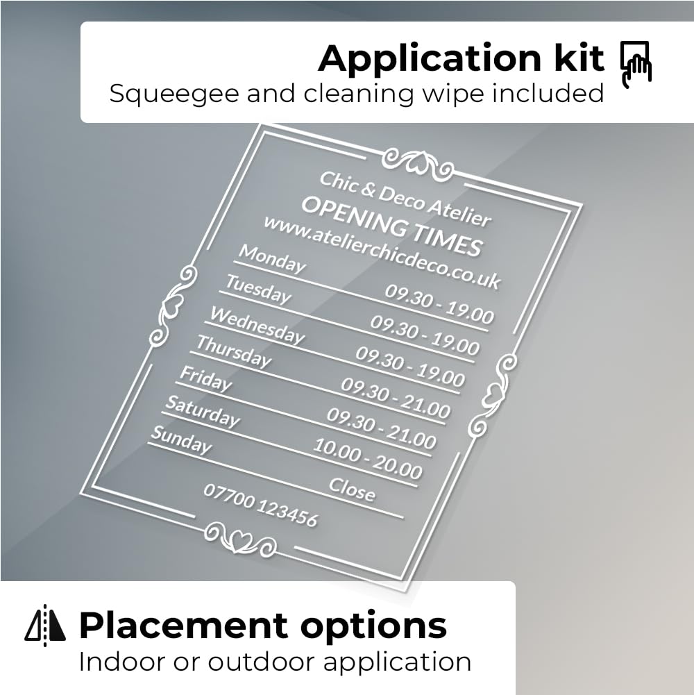 - Personnalisation parfaite : Créez des horaires de magasin personnalisés avec un autocollant de qualité de 30 x 20 cm pour afficher les informations de votre entreprise de manière professionnelle.