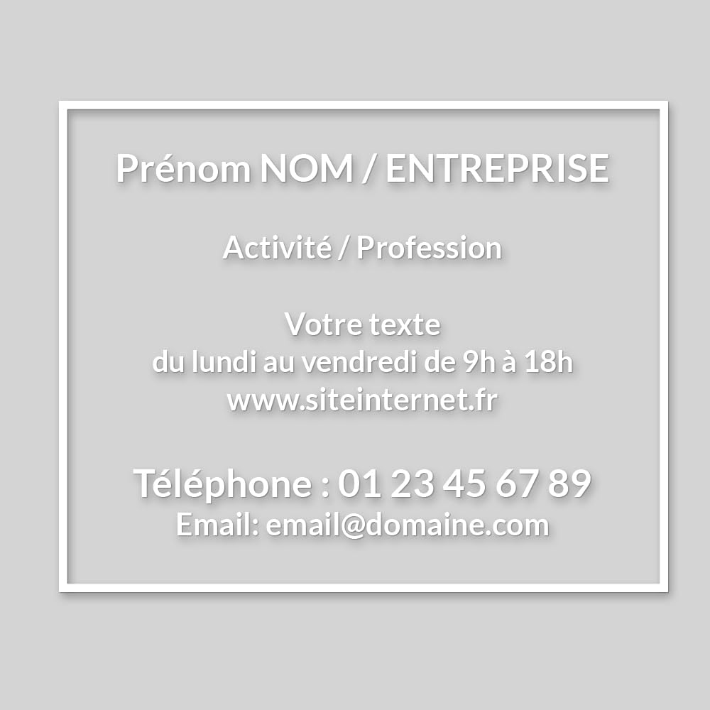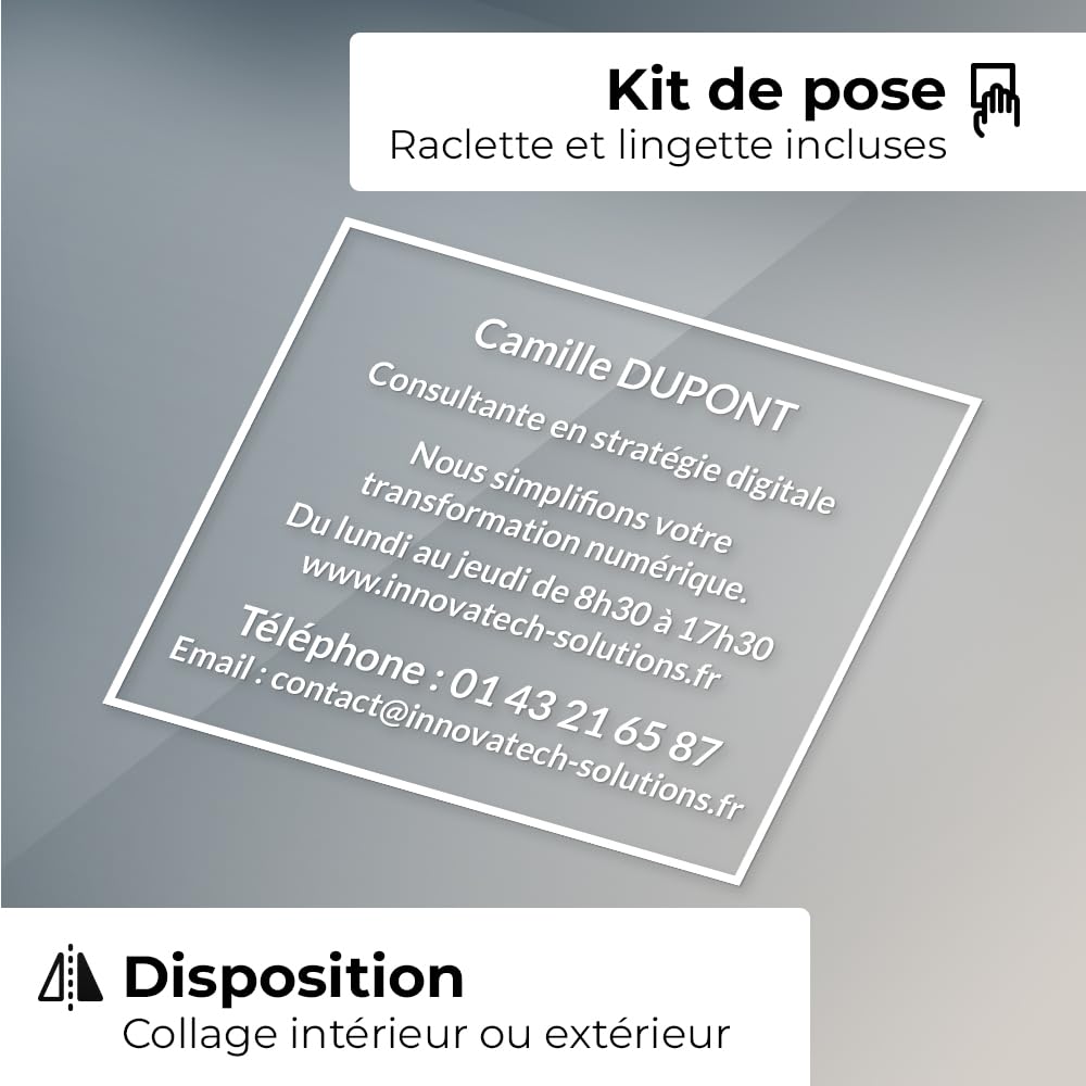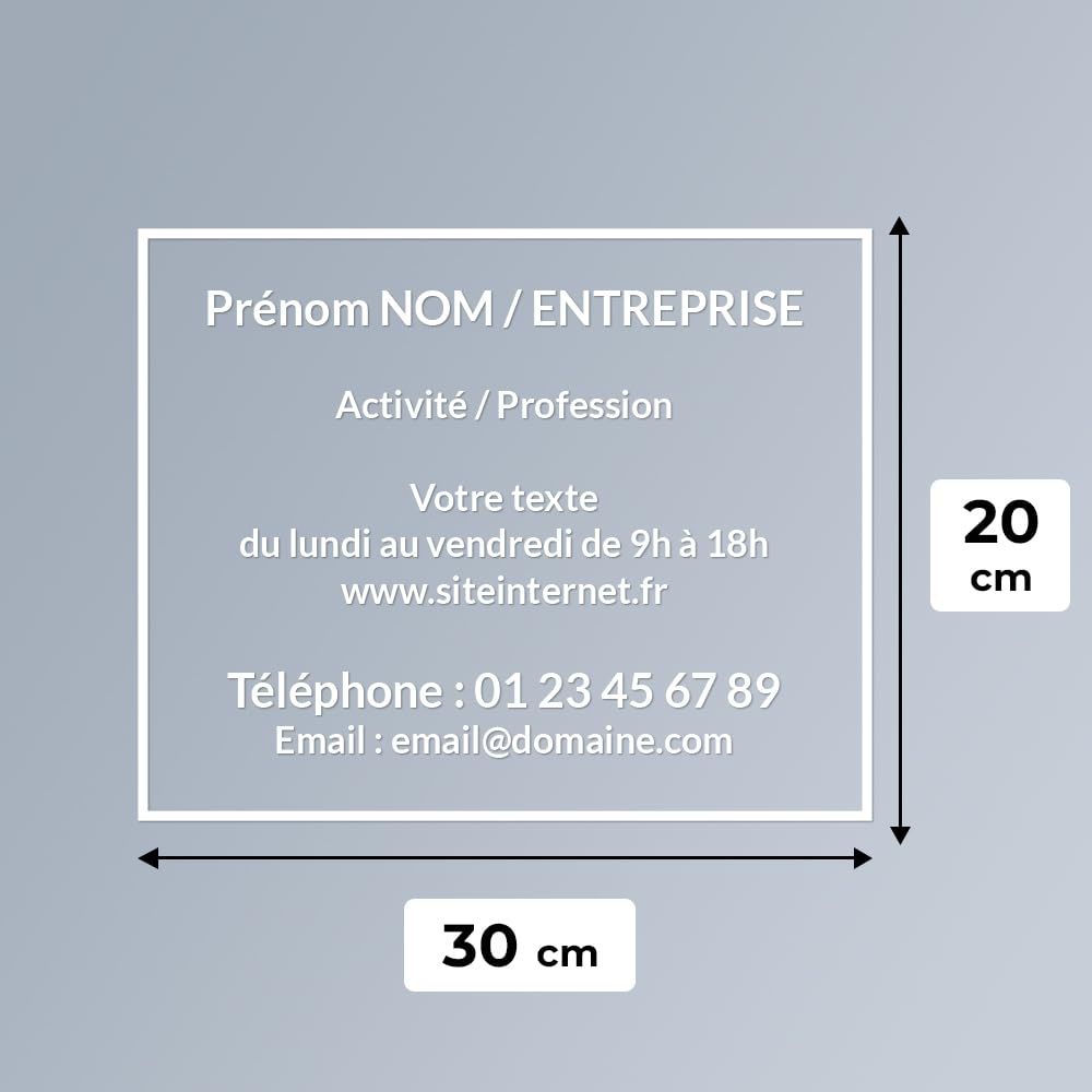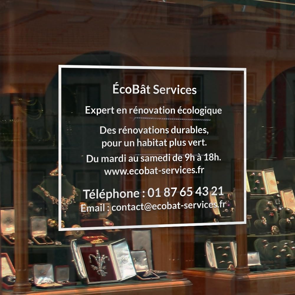 - Personnalisation parfaite : Créez des sticker de vitrine personnalisés avec un autocollant de qualité de 30 x 20 cm pour afficher les informations de votre entreprise de manière professionnelle.
