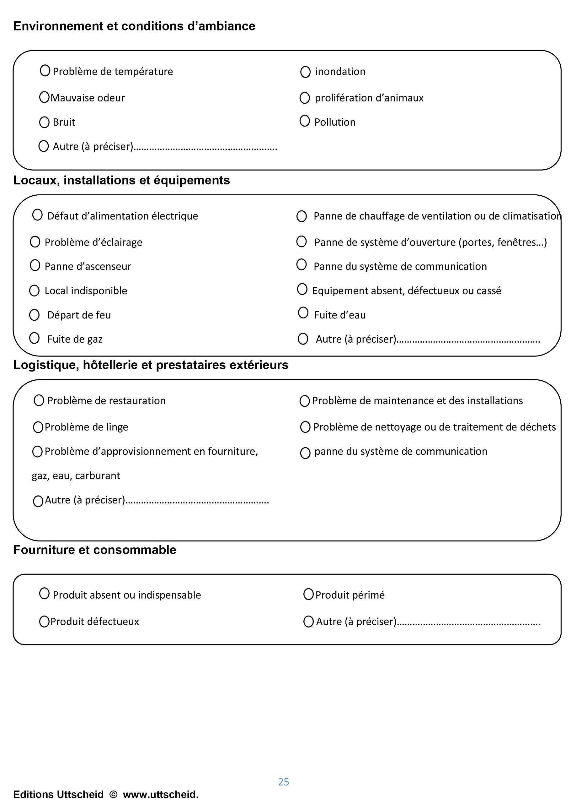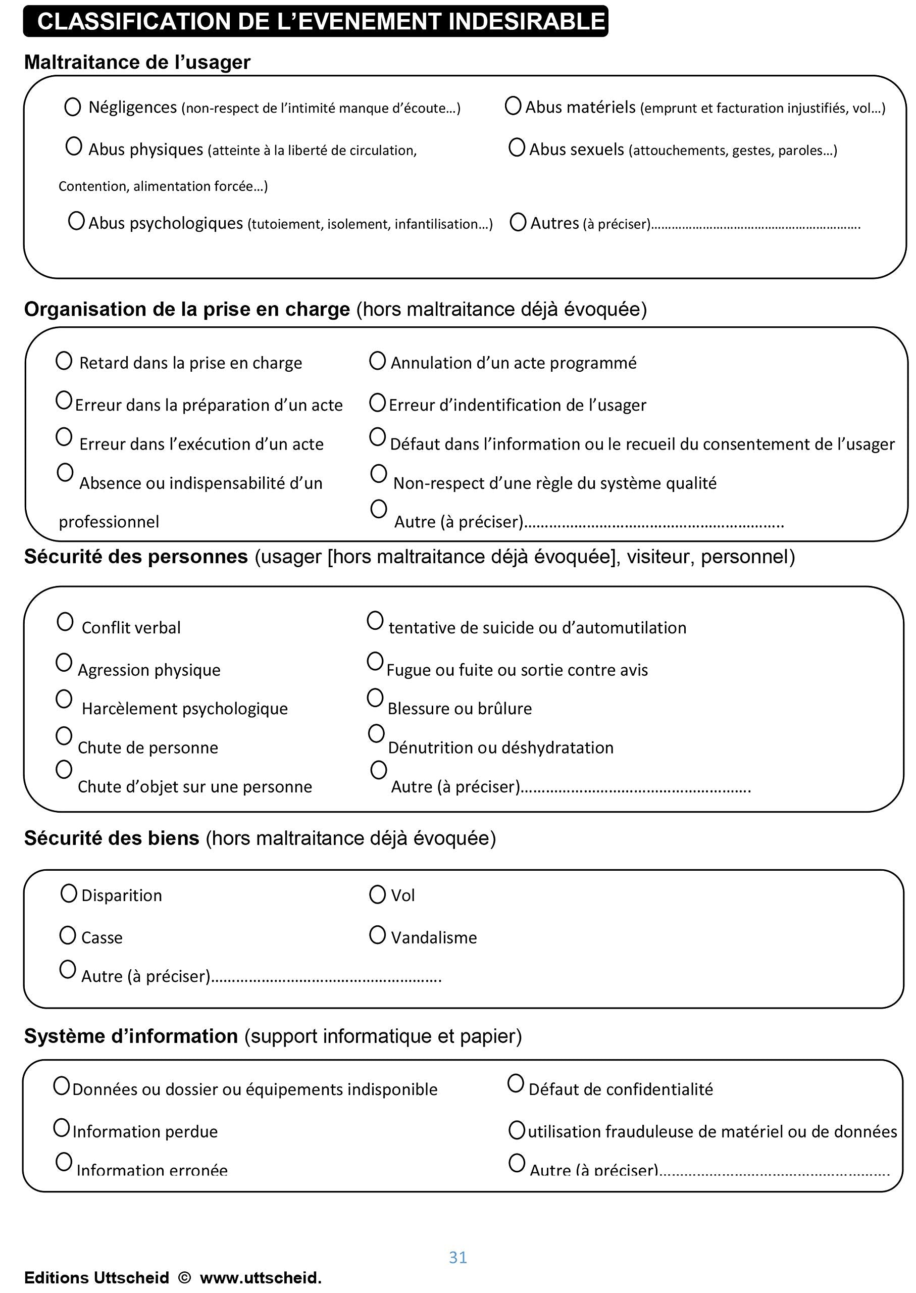 Détails: Signalement des événements indésirables Assurer la traçabilité de tous les événements indésirables susceptibles de survenir dans une structure sanitaire, sociale ou médico-sociale. La tenue de ce registre répond aux exigences de la gestion des risques (ministères de la santé et des affaires sociales, HAS, ANESM, etc). Réglementation : CIRCULAIRE N° DGCS/SD2A/2014/58 du 20 février 2014 relative au renforcement de la lutte contre la maltraitance et au développement de la bien traitance des personnes âgées et des personnes handicapées dans les établissements et services médico-sociaux relevant de la compétence des ARS. Editions Uttscheid, le spécialiste des registres obligatoires par métier