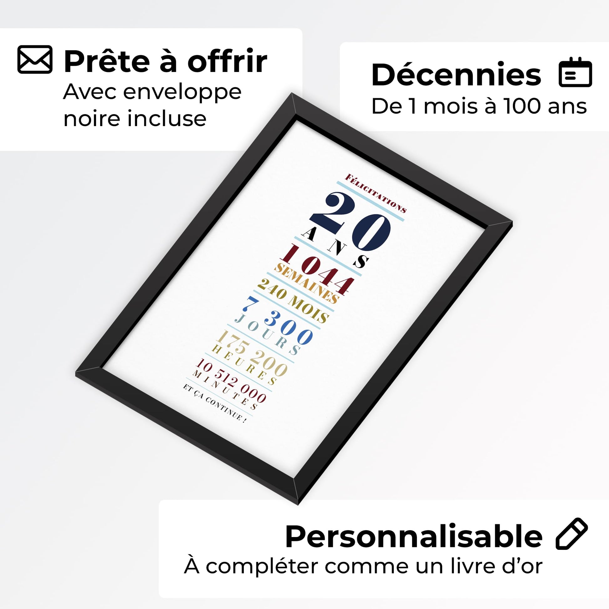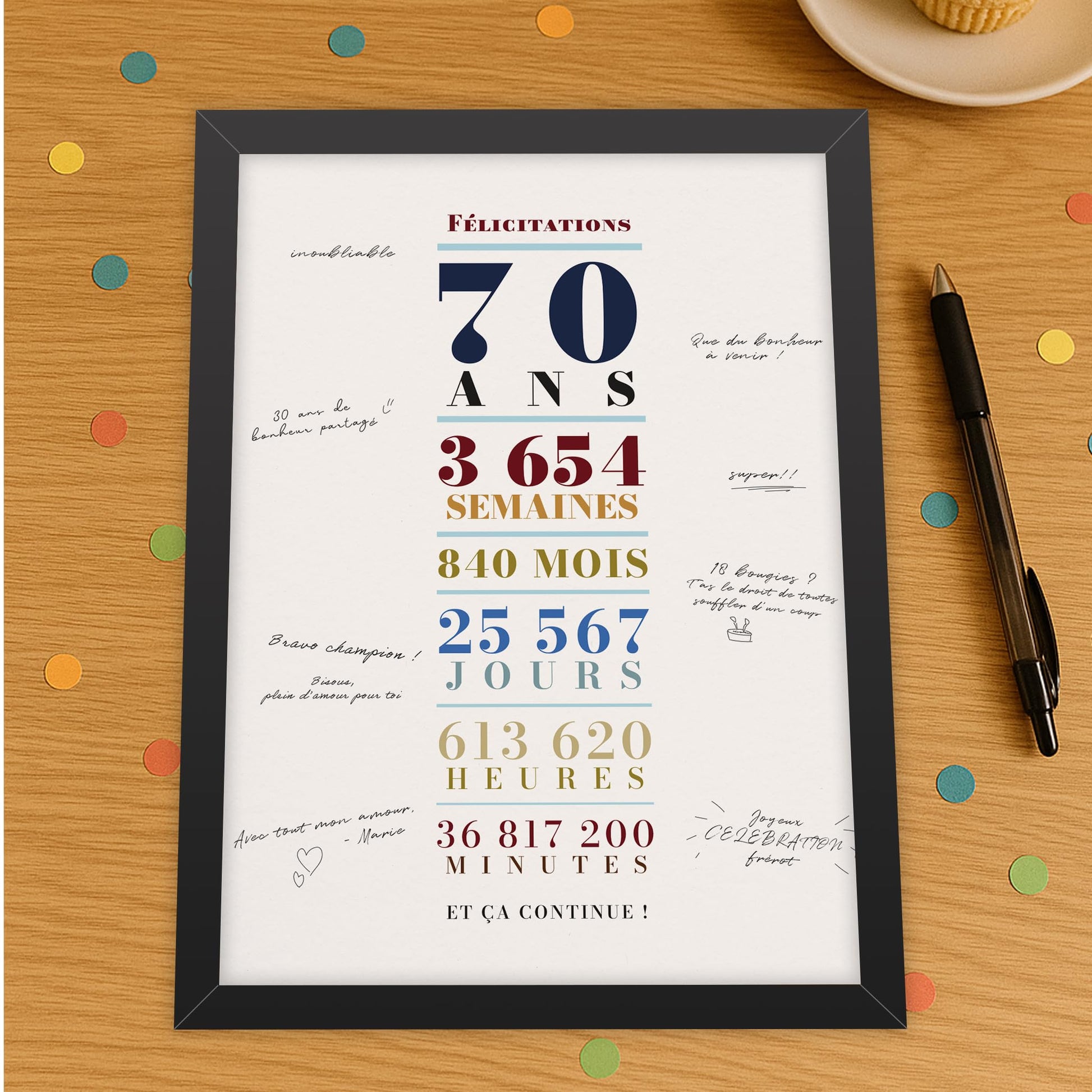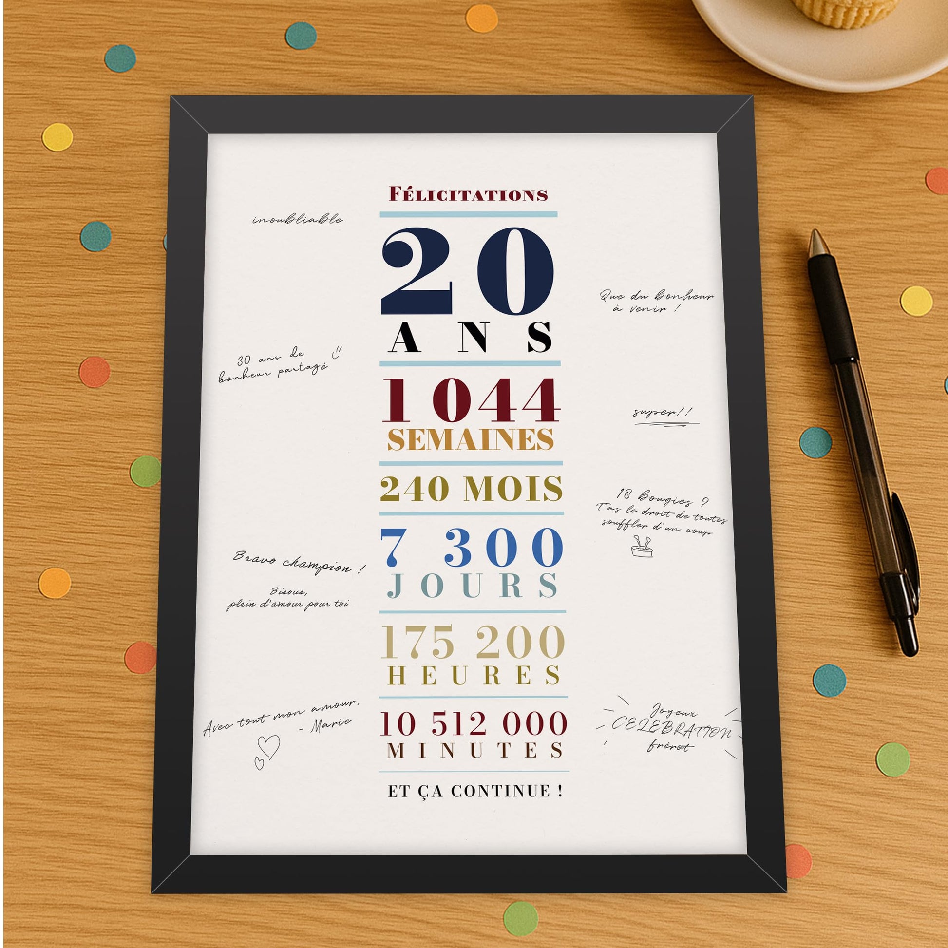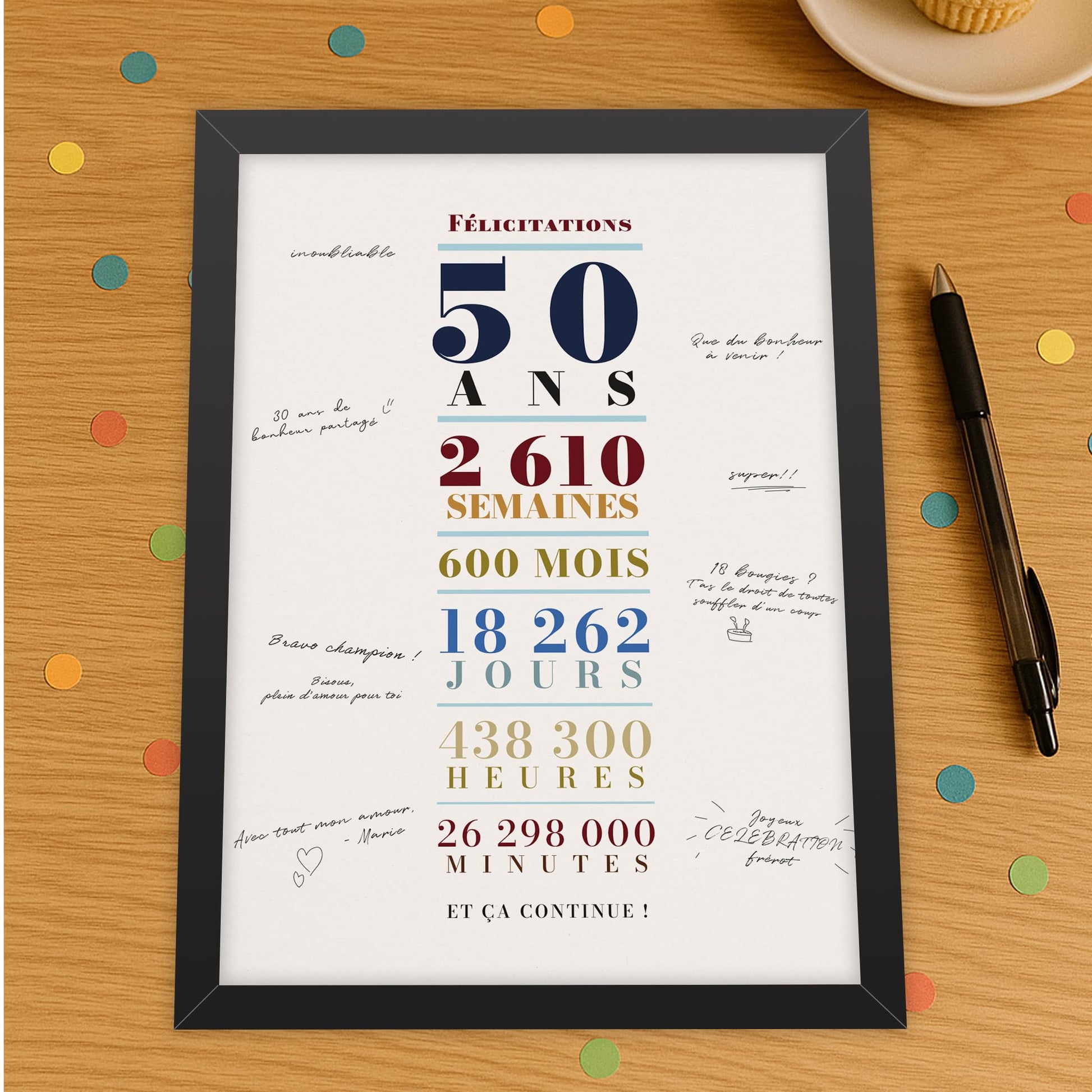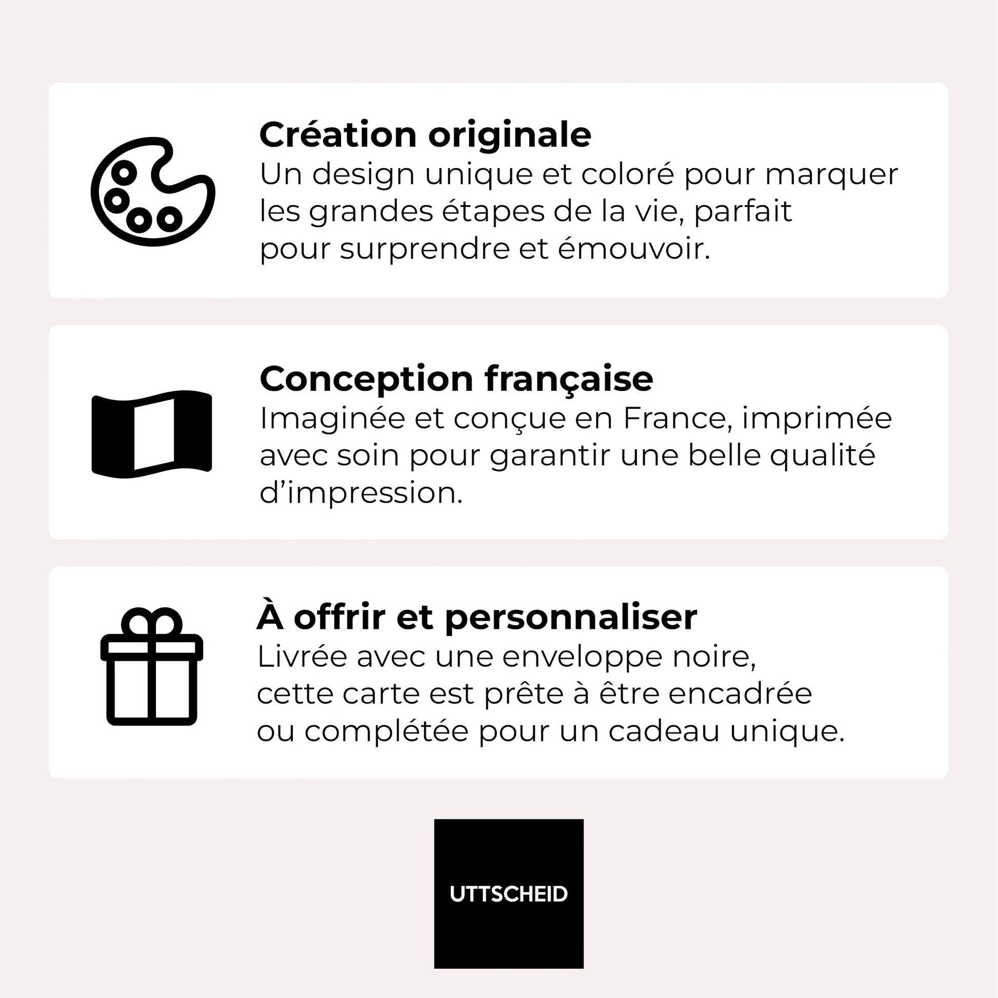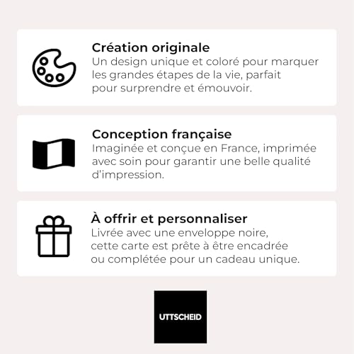 Détails: La carte souvenir personnalisable UTTSCHEID est le cadeau idéal pour célébrer tous les événements marquants : anniversaires, mariages, départs en retraite ou autres occasions spéciales. Avec son élégant format typographique vertical (dimensions A4 : 21 cm x 29,7 cm) et sa qualité premium sur papier épais de 350 gr/m², elle devient un souvenir précieux à conserver longtemps. Livrée avec une élégante enveloppe noire, cette carte souvenir est prête à offrir immédiatement. Vous pouvez opter pour une version avec ou sans cadre, selon vos préférences, afin de sublimer instantanément votre décoration intérieure ou pour créer un cadeau prêt à être exposé. Alternative chic et originale au traditionnel livre d'or, cette affiche permet à chacun d'y apposer ses mots, ses pensées et ses signatures pour créer un souvenir unique et personnel de votre événement. Fabrication française haut de gamme par UTTSCHEID : un gage de qualité, d'élégance et de durabilité. Offrez ou recevez un cadeau mémorable et parfaitement adapté à toutes les occasions spéciales. Disponible avec ou sans cadre, pour s’adapter à toutes les envies et tous les intérieurs.