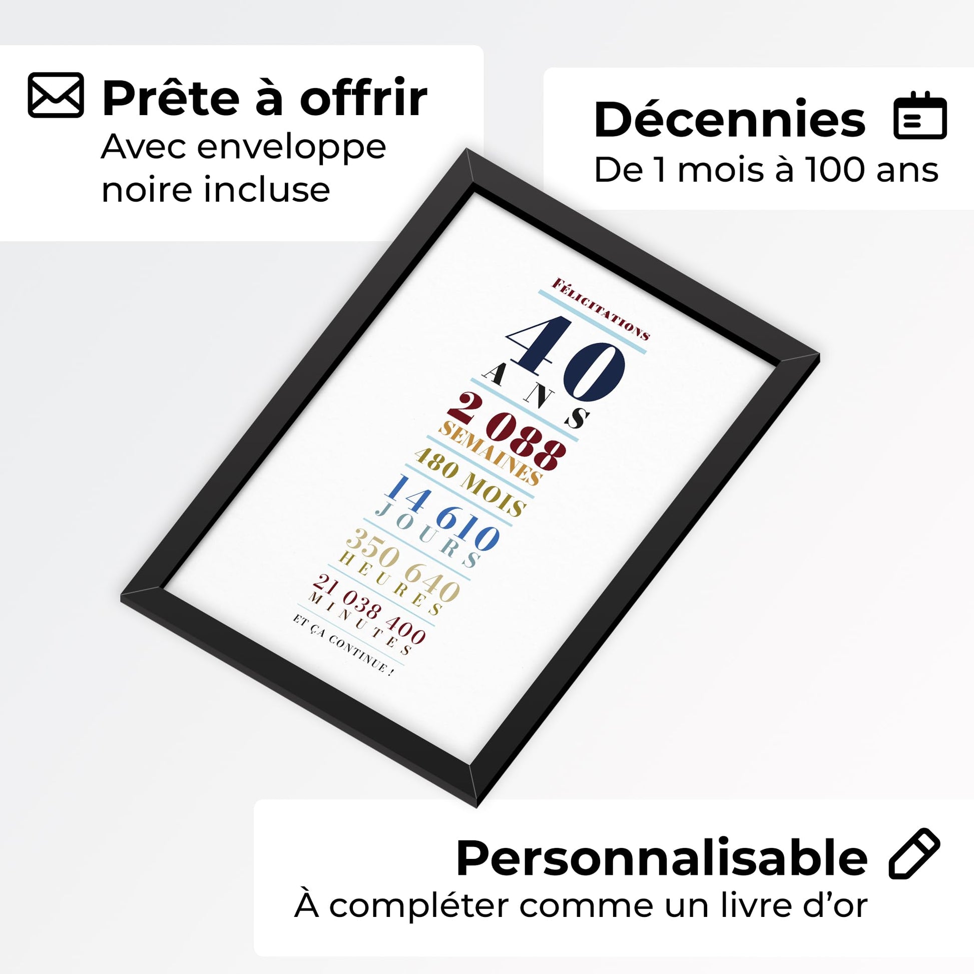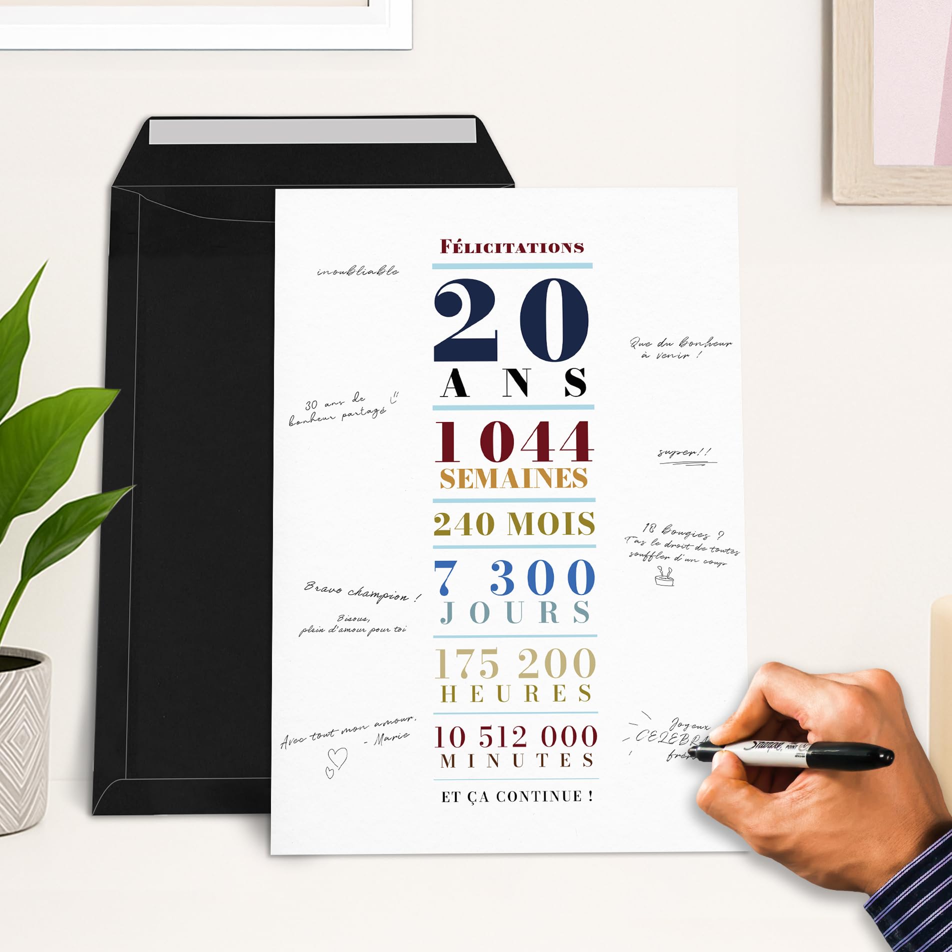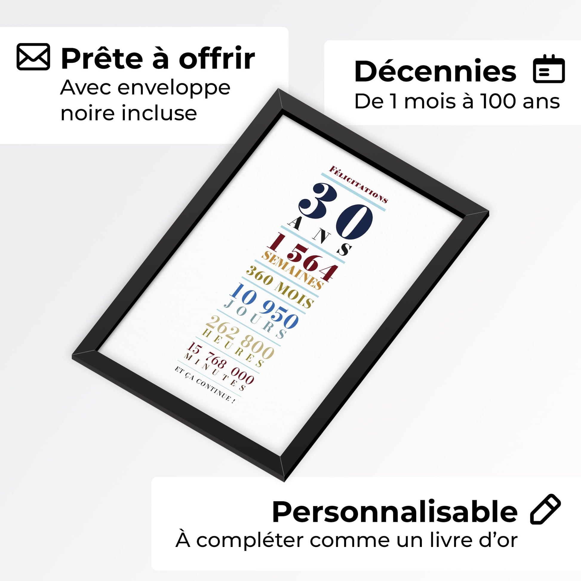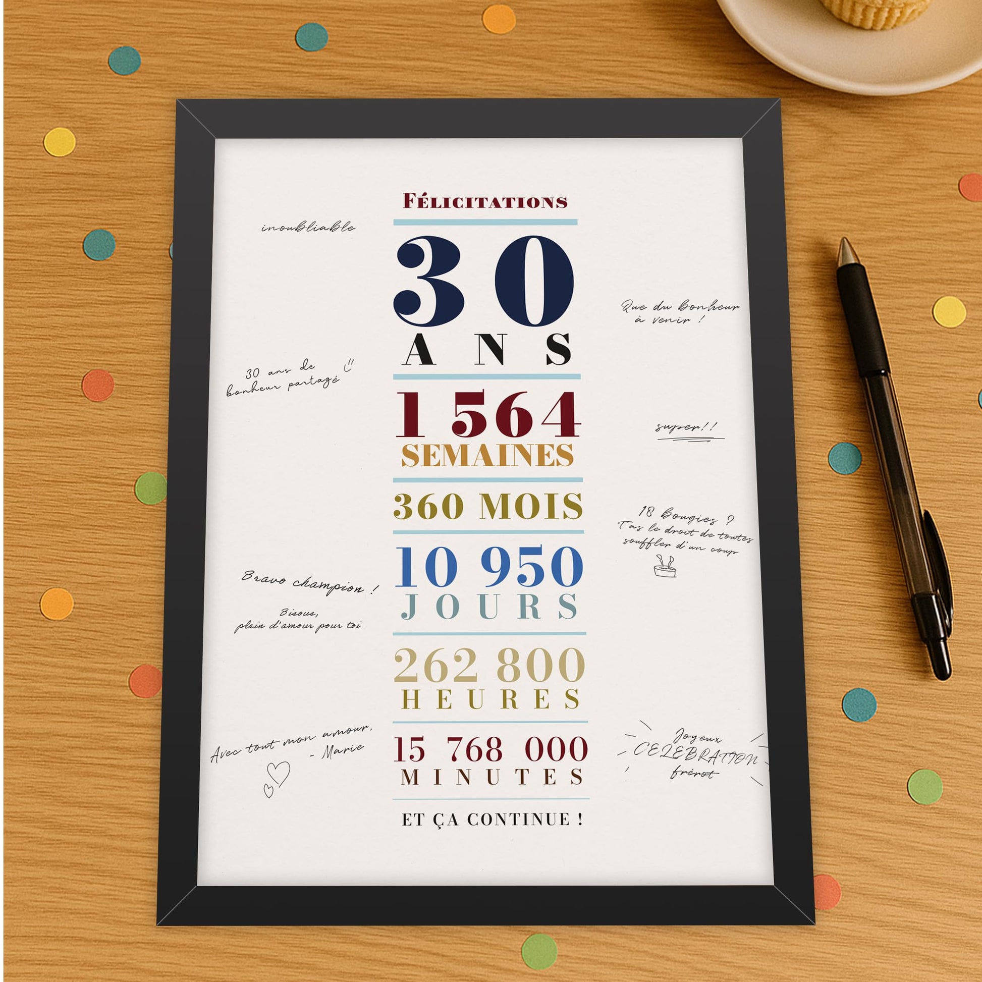 Détails: La carte souvenir personnalisable UTTSCHEID est le cadeau idéal pour célébrer tous les événements marquants : anniversaires, mariages, départs en retraite ou autres occasions spéciales. Avec son élégant format typographique vertical (dimensions A4 : 21 cm x 29,7 cm) et sa qualité premium sur papier épais de 350 gr/m², elle devient un souvenir précieux à conserver longtemps. Livrée avec une élégante enveloppe noire, cette carte souvenir est prête à offrir immédiatement. Vous pouvez opter pour une version avec ou sans cadre, selon vos préférences, afin de sublimer instantanément votre décoration intérieure ou pour créer un cadeau prêt à être exposé. Alternative chic et originale au traditionnel livre d'or, cette affiche permet à chacun d'y apposer ses mots, ses pensées et ses signatures pour créer un souvenir unique et personnel de votre événement. Fabrication française haut de gamme par UTTSCHEID : un gage de qualité, d'élégance et de durabilité. Offrez ou recevez un cadeau mémorable et parfaitement adapté à toutes les occasions spéciales. Disponible avec ou sans cadre, pour s’adapter à toutes les envies et tous les intérieurs.