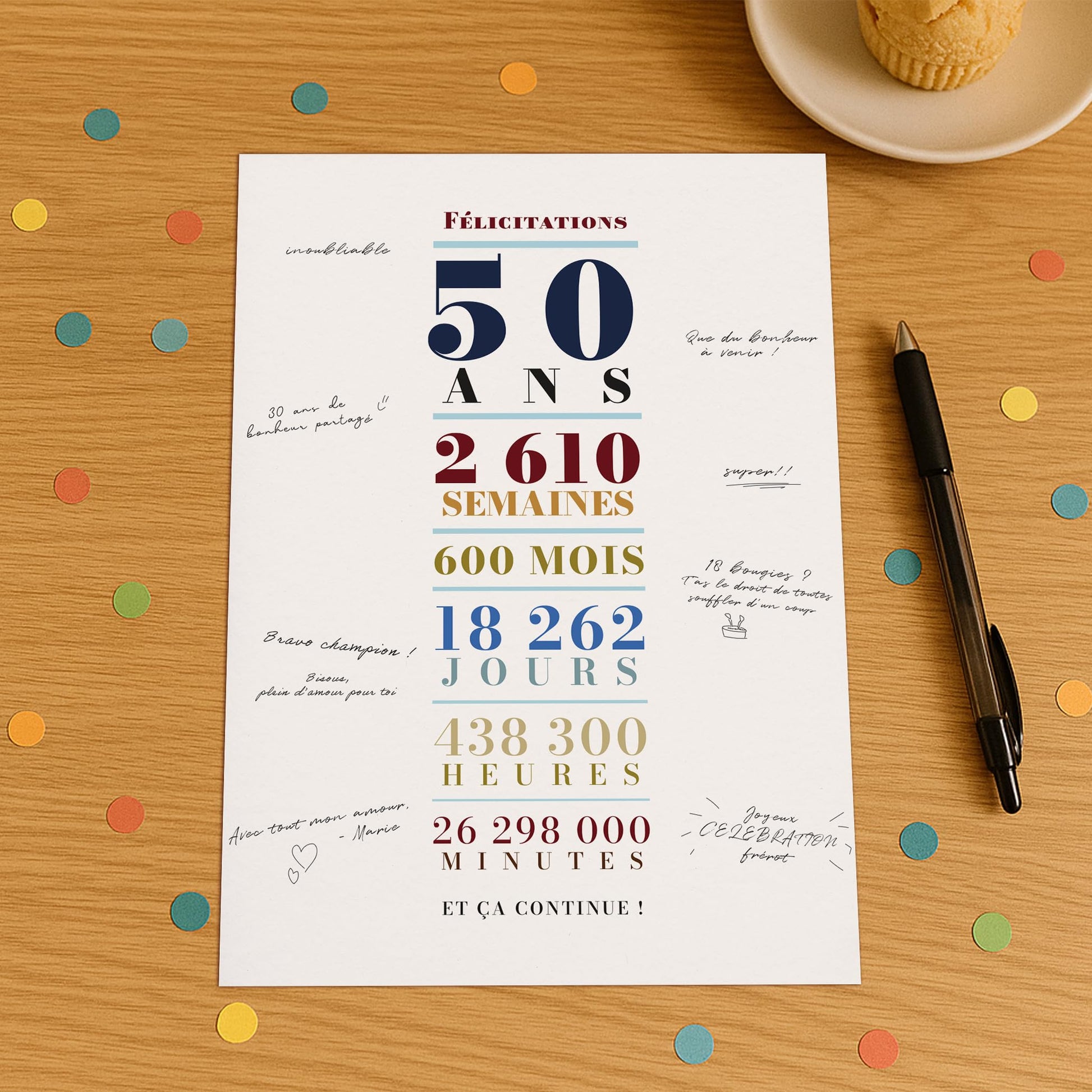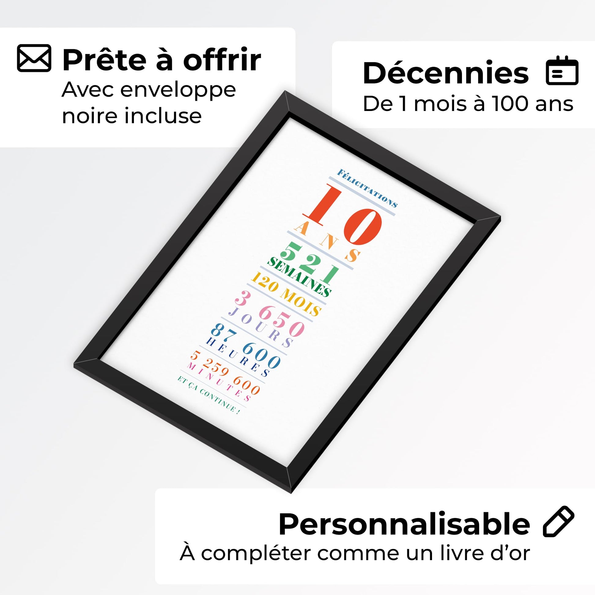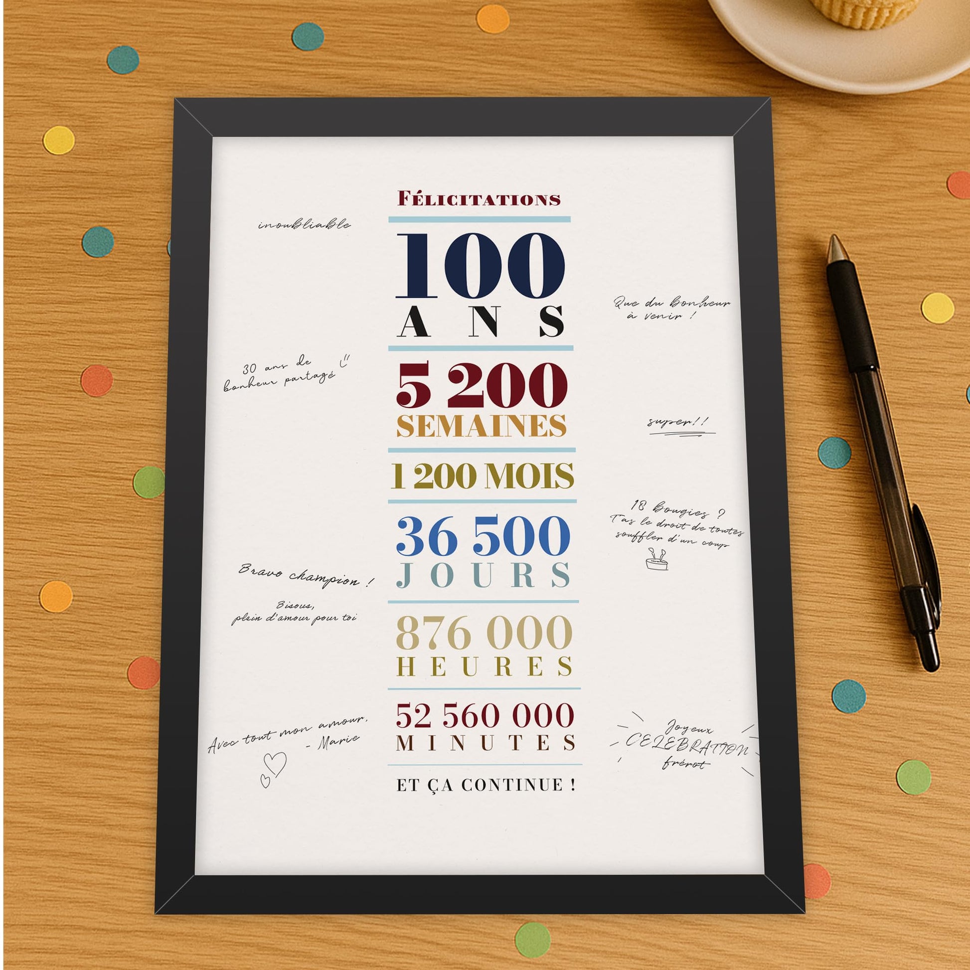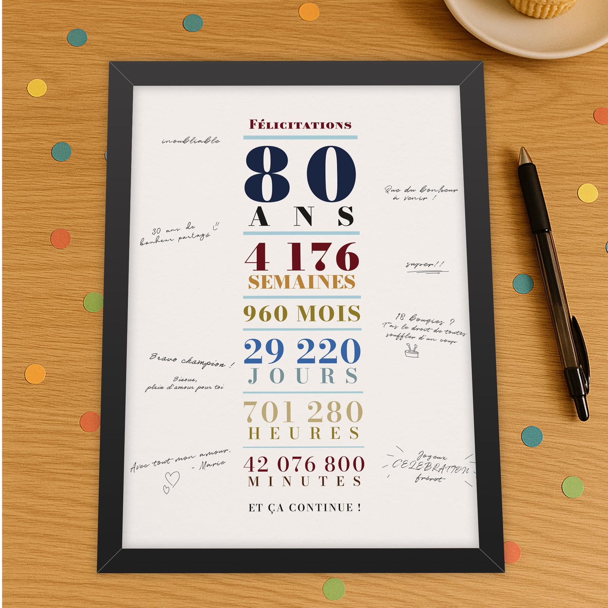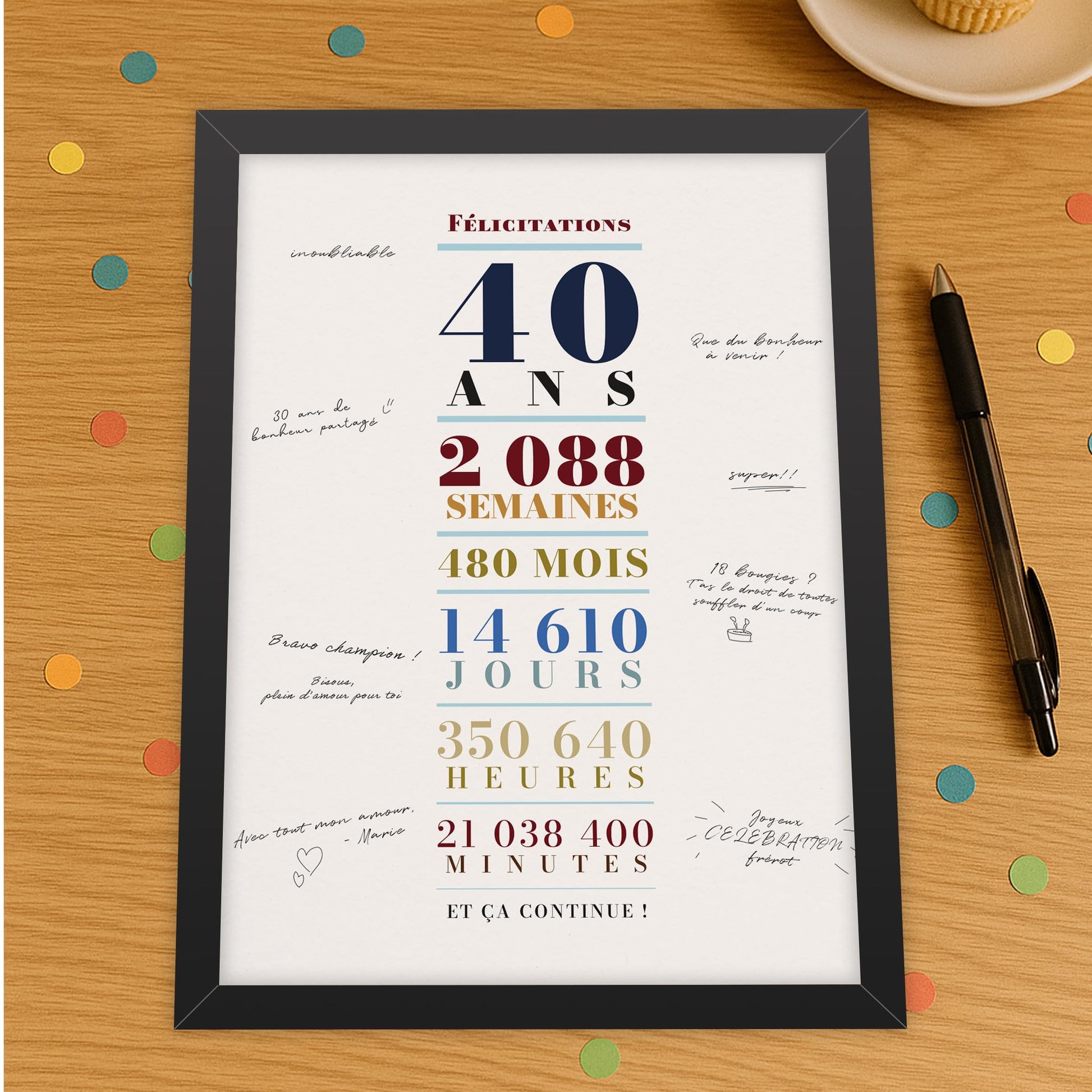 Détails: La carte souvenir personnalisable UTTSCHEID est le cadeau idéal pour célébrer tous les événements marquants : anniversaires, mariages, départs en retraite ou autres occasions spéciales. Avec son élégant format typographique vertical (dimensions A4 : 21 cm x 29,7 cm) et sa qualité premium sur papier épais de 350 gr/m², elle devient un souvenir précieux à conserver longtemps. Livrée avec une élégante enveloppe noire, cette carte souvenir est prête à offrir immédiatement. Vous pouvez opter pour une version avec ou sans cadre, selon vos préférences, afin de sublimer instantanément votre décoration intérieure ou pour créer un cadeau prêt à être exposé. Alternative chic et originale au traditionnel livre d'or, cette affiche permet à chacun d'y apposer ses mots, ses pensées et ses signatures pour créer un souvenir unique et personnel de votre événement. Fabrication française haut de gamme par UTTSCHEID : un gage de qualité, d'élégance et de durabilité. Offrez ou recevez un cadeau mémorable et parfaitement adapté à toutes les occasions spéciales. Disponible avec ou sans cadre, pour s’adapter à toutes les envies et tous les intérieurs.