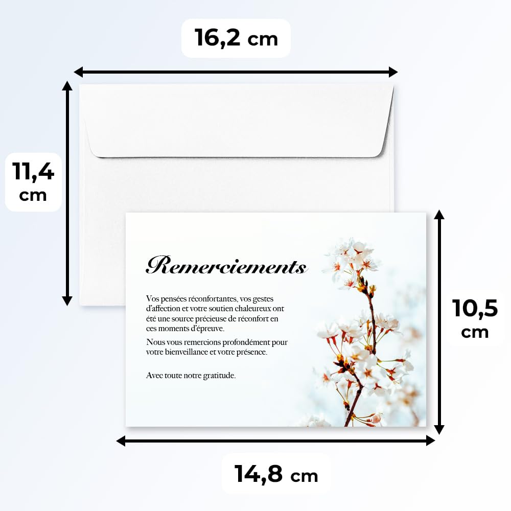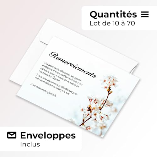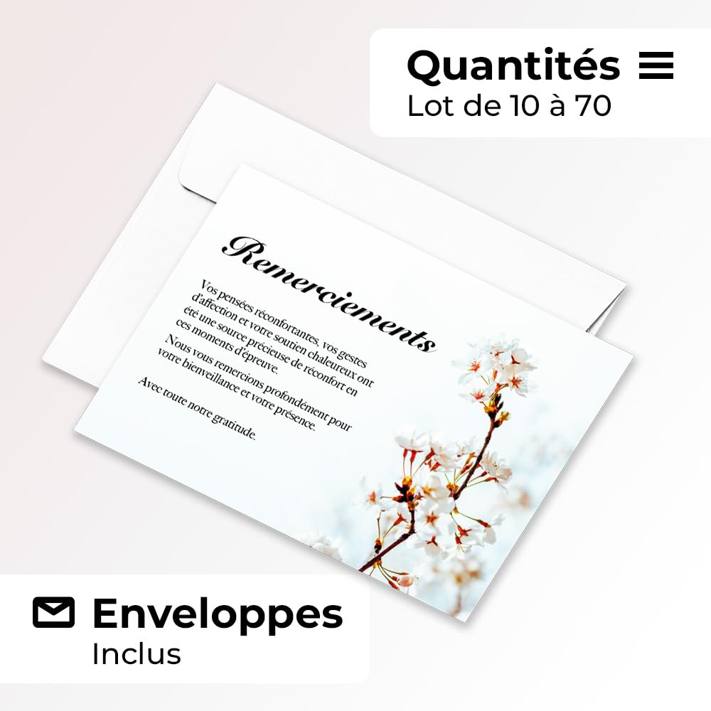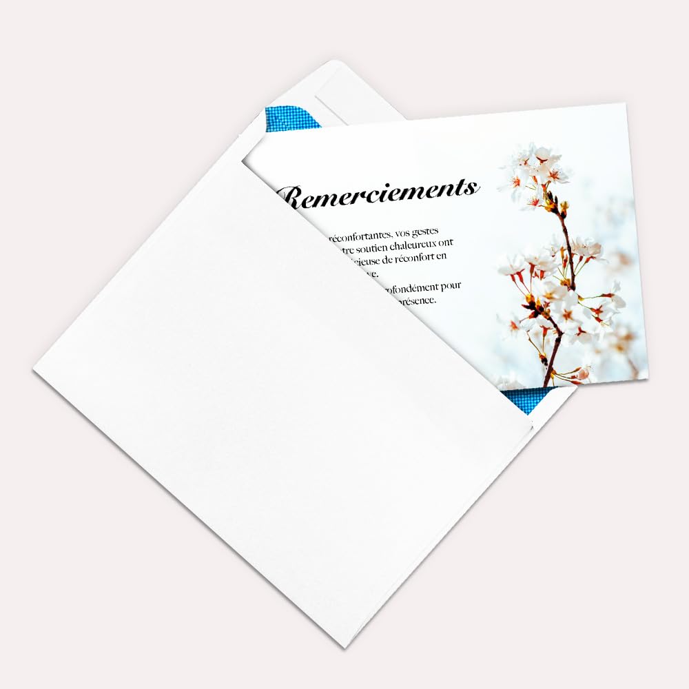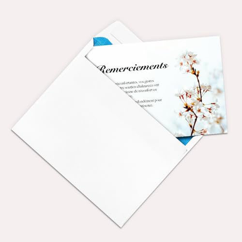 - Inclus avec enveloppes blanches : Chaque lot est accompagné d’enveloppes blanches de qualité, prêtes à l’envoi pour simplifier vos démarches de remerciement.