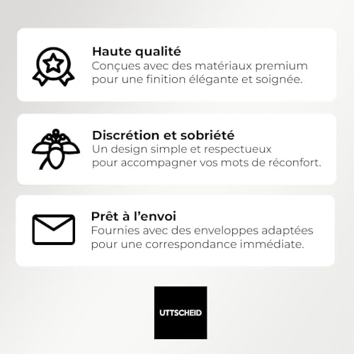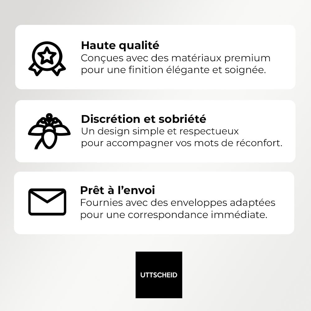 Détails: Design raffiné et respectueux : Ces cartes de remerciement deuil sont conçues avec un visuel sobre et élégant, parfaitement adapté pour transmettre vos pensées de gratitude dans des moments difficiles. Format pratique A6 (10,5 x 14,8 cm) : Un format compact idéal pour une manipulation facile et un envoi postal standard, tout en conservant une lisibilité optimale. Impression haute qualité sur papier couché 350 g/m² : Chaque carte est imprimée recto uniquement sur un papier couché premium de 350 grammes, offrant une surface lisse et un rendu professionnel pour une présentation soignée. Inclus avec enveloppes blanches : Chaque lot est accompagné d’enveloppes blanches de qualité, prêtes à l’envoi pour simplifier vos démarches de remerciement. Disponible en plusieurs lots : Choisissez parmi des lots de 5, 10, 30, 50 ou 70 cartes selon vos besoins, pour répondre de manière flexible à toutes les situations.