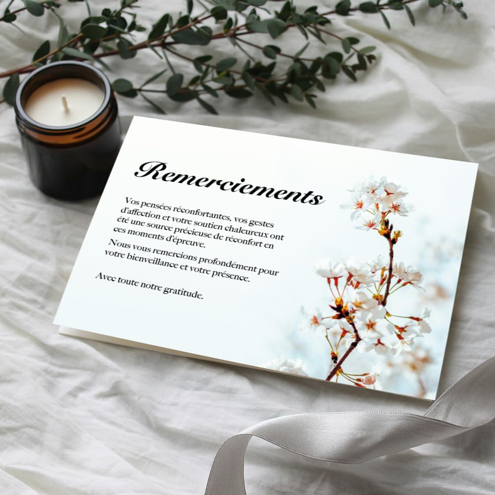 - Design élégant et sobre : Ces cartes de remerciement deuil présentent un visuel raffiné et intemporel, parfaitement adapté pour exprimer votre gratitude avec respect et discrétion en de telles circonstances.