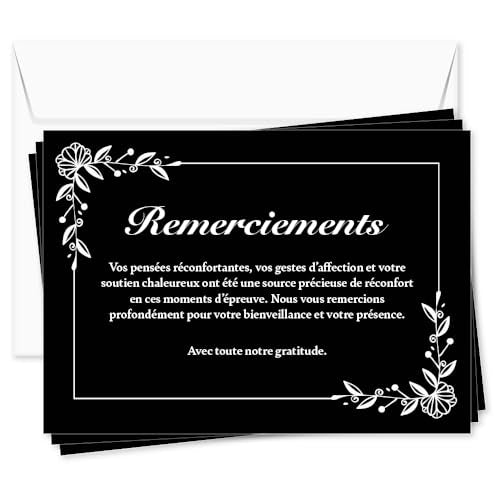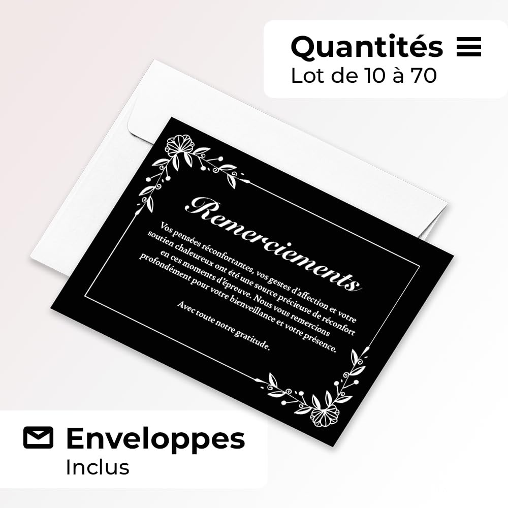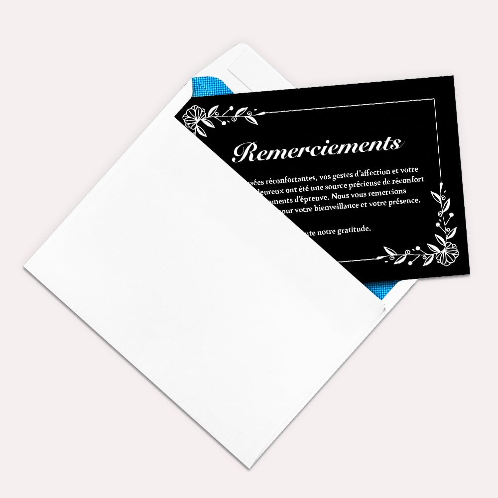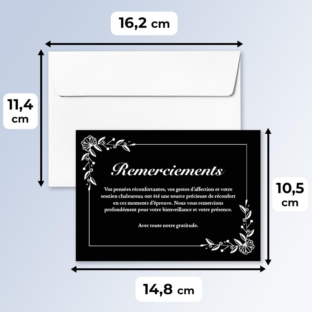 - Inclus avec enveloppes blanches : Chaque lot est accompagné d’enveloppes blanches de qualité, prêtes à l’envoi pour simplifier vos démarches de remerciement.