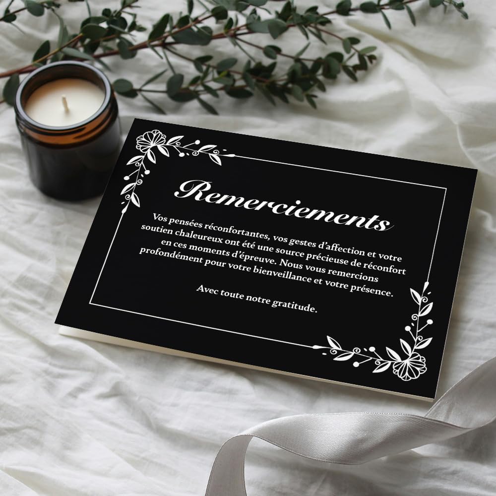 - Design élégant et sobre : Ces cartes de remerciement deuil présentent un visuel raffiné et intemporel, parfaitement adapté pour exprimer votre gratitude avec respect et discrétion en de telles circonstances.