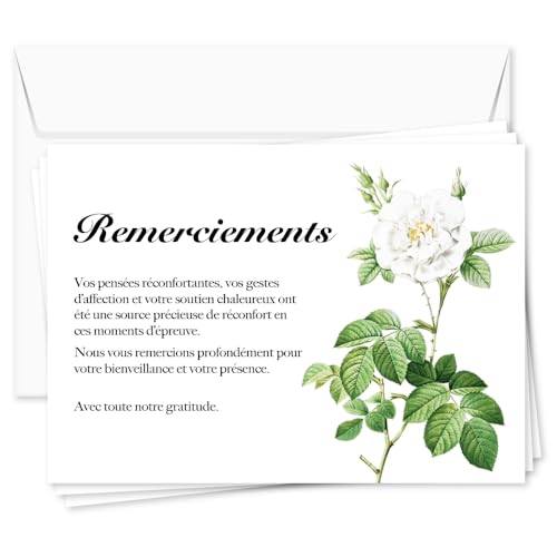 - Inclus avec enveloppes blanches : Chaque lot est accompagné d’enveloppes blanches de qualité, prêtes à l’envoi pour simplifier vos démarches de remerciement.